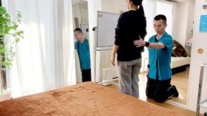 検査では、姿勢のチェックだけでなく、関節の可動域、筋肉の硬さ